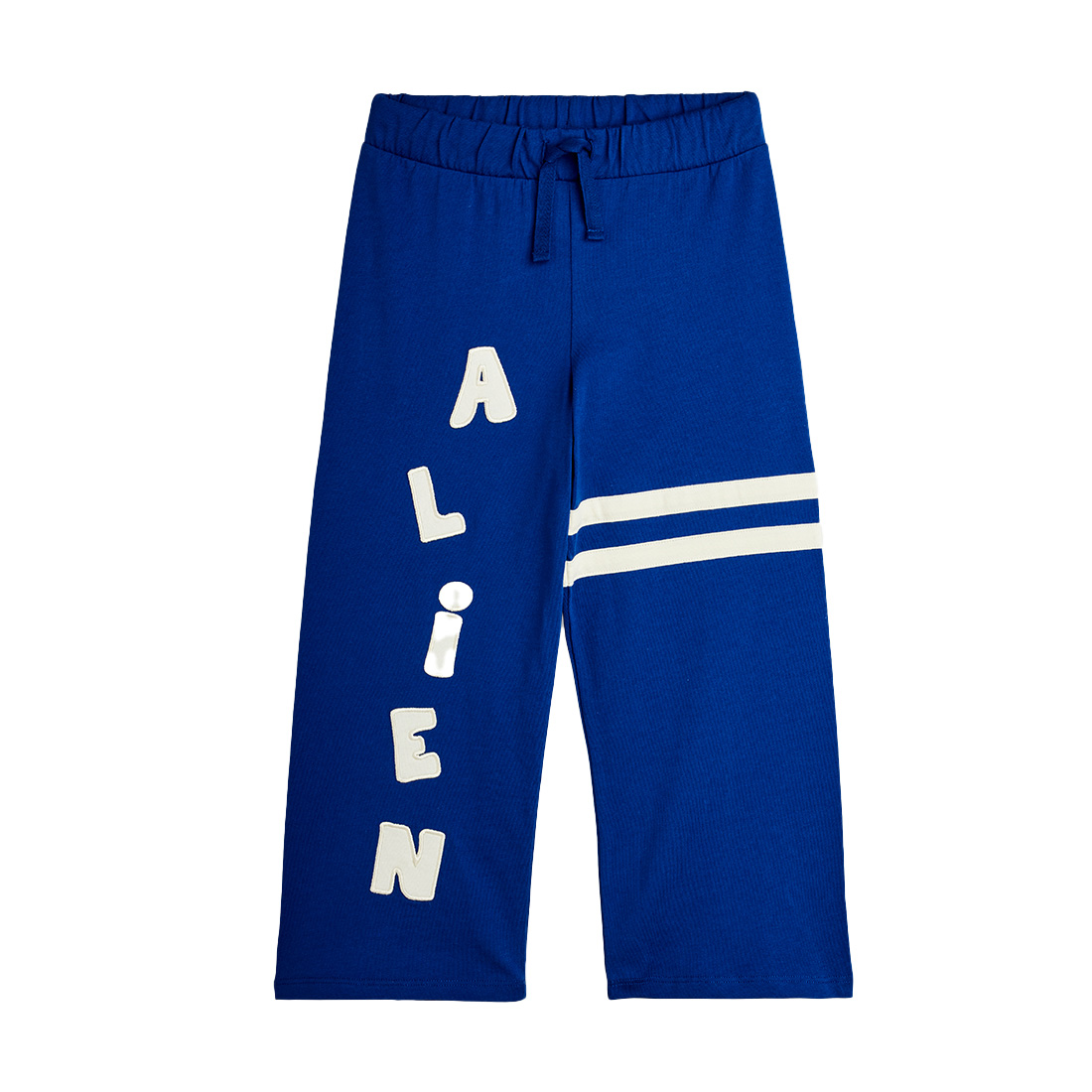 Designed with a comfy elastic waistband and drawstring, appliqué “ALIEN” lettering down one leg and contrast stripes on the other.