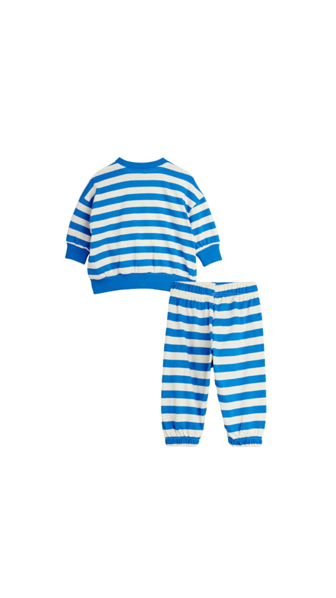 Striped sweatshirt with ribbed trims, Earth motif at chest and snap buttons at shoulder. Matching pants with elastic waist and elasticated cuffs for a comfy fit.